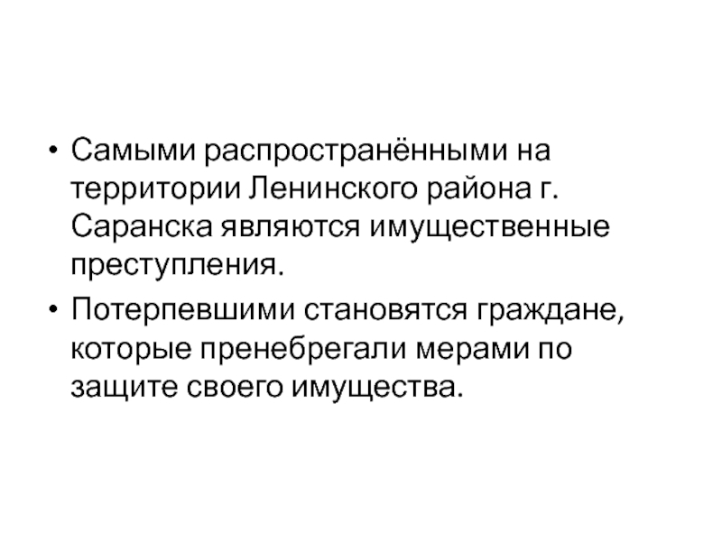 Самыми распространёнными на территории Ленинского района г.Саранска являются имущественные преступления.Потерпевшими становятся граждане, которые пренебрегали мерами по защите