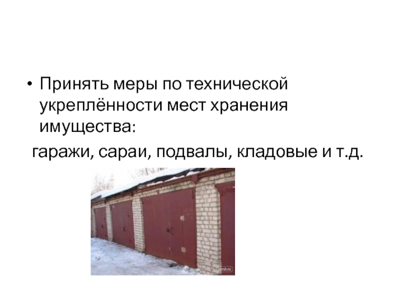Принять меры по технической укреплённости мест хранения имущества: гаражи, сараи, подвалы, кладовые и т.д.