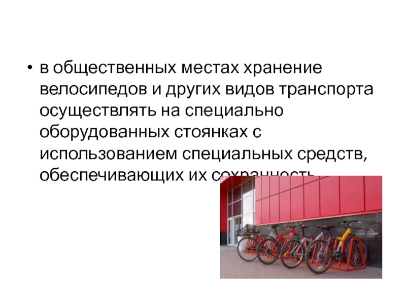Слайд 6в общественных местах хранение велосипедов и других видов транспорта осуществлять