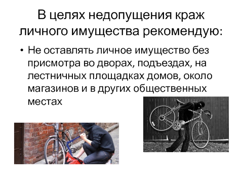 В целях недопущения краж личного имущества рекомендую:Не оставлять личное имущество без присмотра во дворах, подъездах, на лестничных