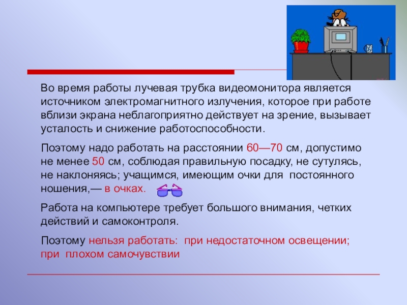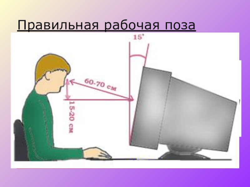 Экран монитора должен находиться от глаз пользователя на оптимальном расстоянии 60-70 см, но не ближе 50 см