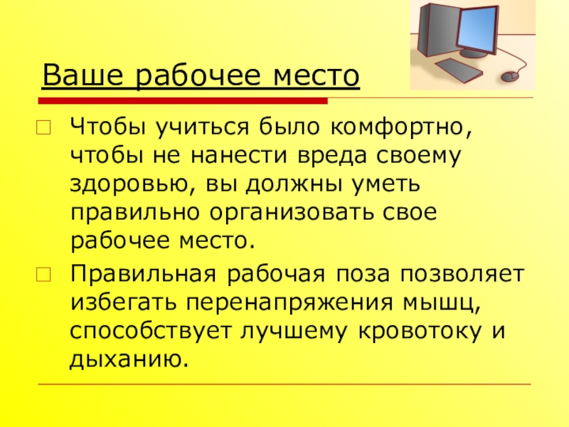 своему здоровью, вы должны уметь правильно организовать свое рабочее место.