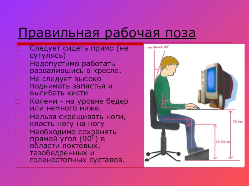 рабочая поза позволяет избегать перенапряжения мышц, способствует лучшему кровотоку и дыханию.