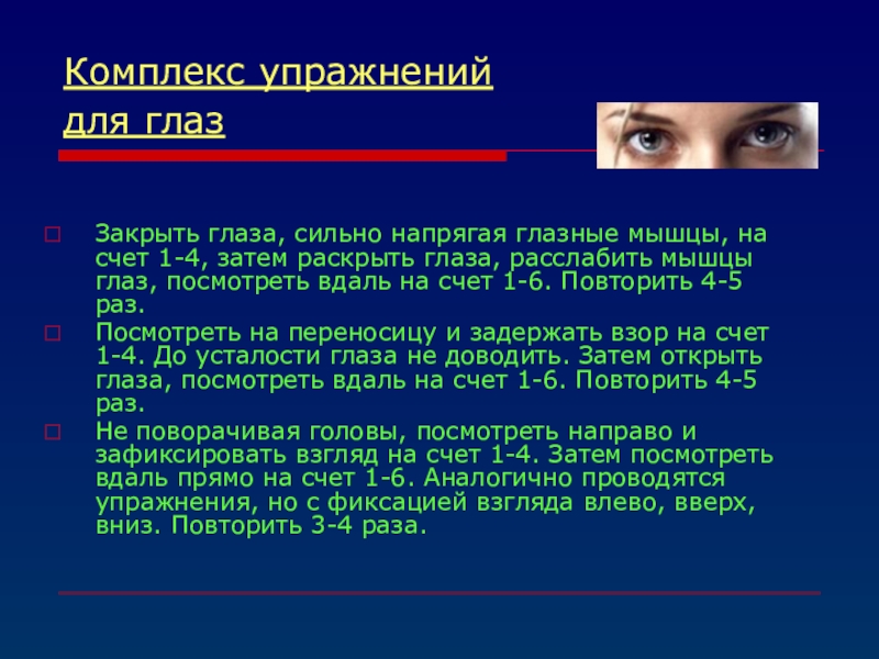 счет 1-4, затем раскрыть глаза, расслабить мышцы глаз, посмотреть вдаль
