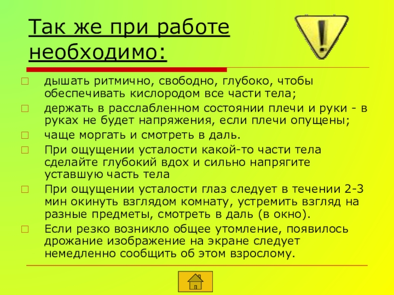 Если резко возникло общее утомление, появилось дрожание изображение на экране следует немедленно сообщить об этом взрослому.