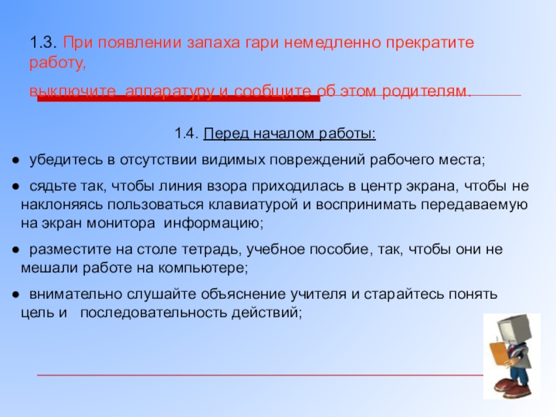 1.3. При появлении запаха гари немедленно прекратите работу,