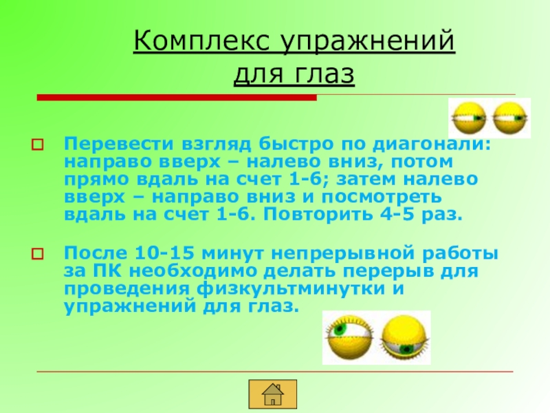 После 10-15 минут непрерывной работы за ПК необходимо делать перерыв для проведения физкультминутки и упражнений для глаз.
