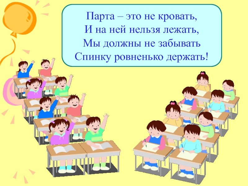 Парта – это не кровать, И на ней нельзя лежать, Мы должны не забывать Спинку ровненько держать!