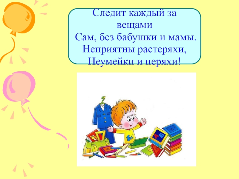 Следит каждый за вещами Сам, без бабушки и мамы. Неприятны растеряхи, Неумейки и неряхи!
