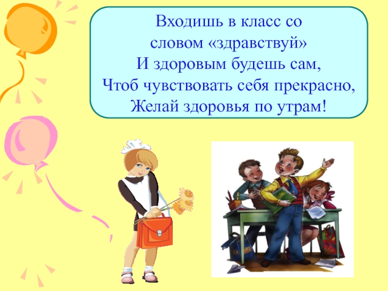 Входишь в класс со словом «здравствуй» И здоровым будешь сам, Чтоб чувствовать себя прекрасно, Желай здоровья по