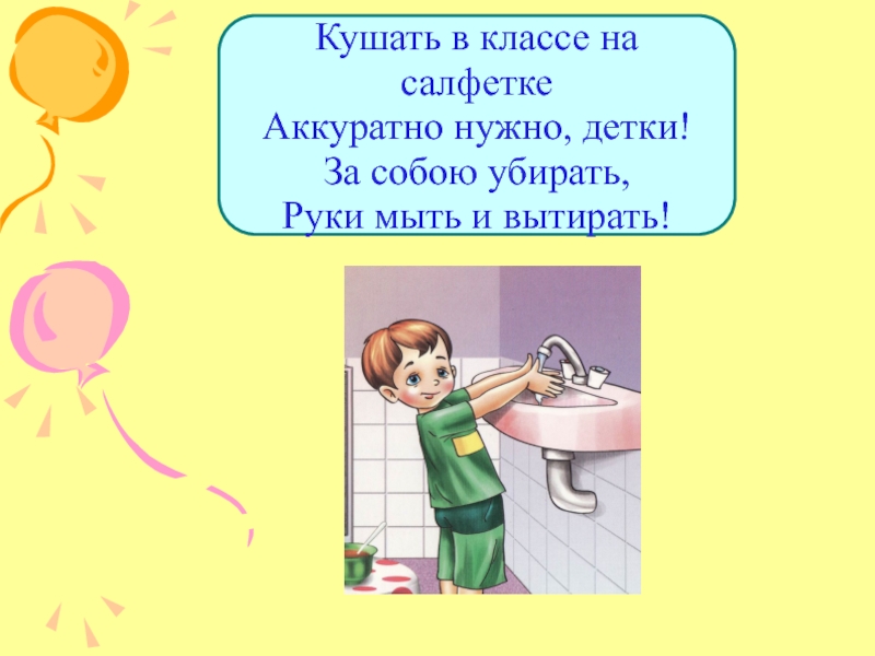 Слайд 12Кушать в классе на салфетке Аккуратно нужно, детки! За собою убирать, Руки мыть