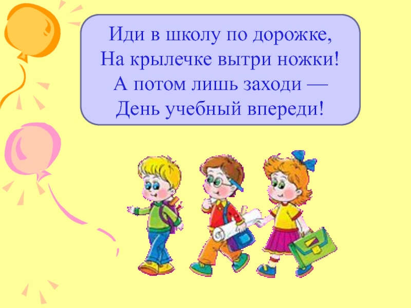 Иди в школу по дорожке, На крылечке вытри ножки! А потом лишь заходи — День учебный впереди!