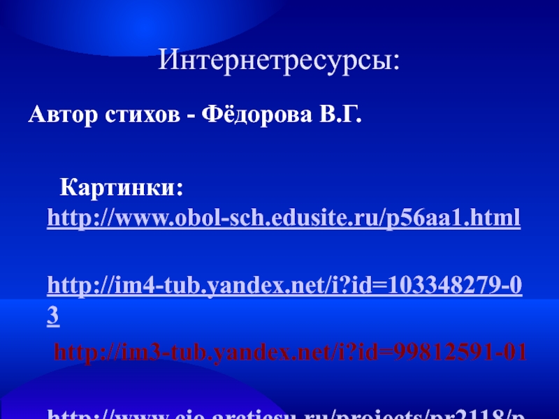 Интернетресурсы:Автор стихов - Фёдорова В.Г.       Картинки: http://www.obol-sch.edusite.ru/p56aa1.html  http://im4-tub.yandex.net/i?id=103348279-03  http://im3-tub.yandex.net/i?id=99812591-01