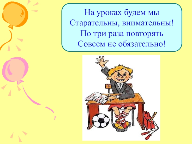 Слайд 7На уроках будем мы Старательны, внимательны! По три раза повторять Совсем не обязательно!