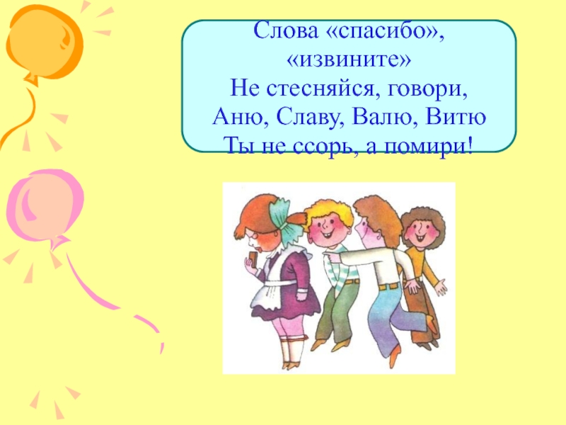 Слайд 14Слова «спасибо», «извините» Не стесняйся, говори, Аню, Славу, Валю, Витю Ты не ссорь,
