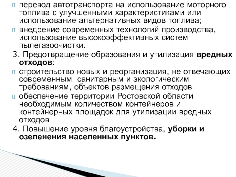 Слайд 49перевод автотранспорта на использование моторного топлива с улучшенными характеристиками или