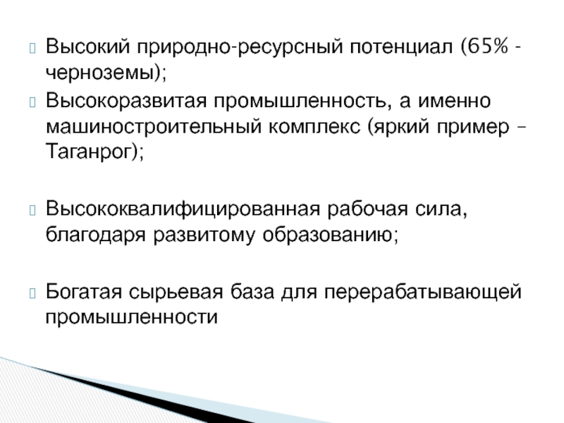 Слайд 28Высокий природно-ресурсный потенциал (65% - черноземы);