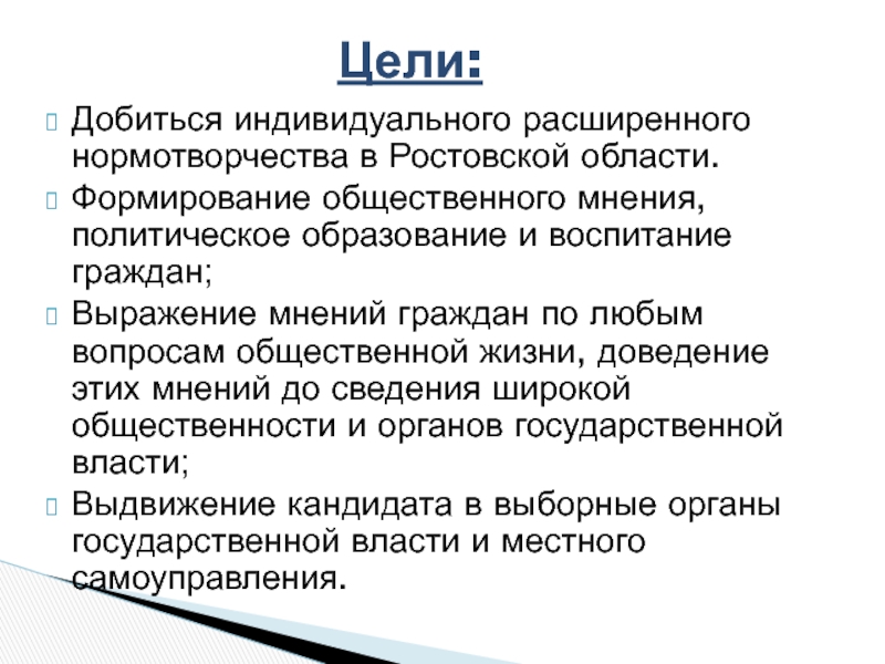Слайд 2Добиться индивидуального расширенного нормотворчества в Ростовской области.