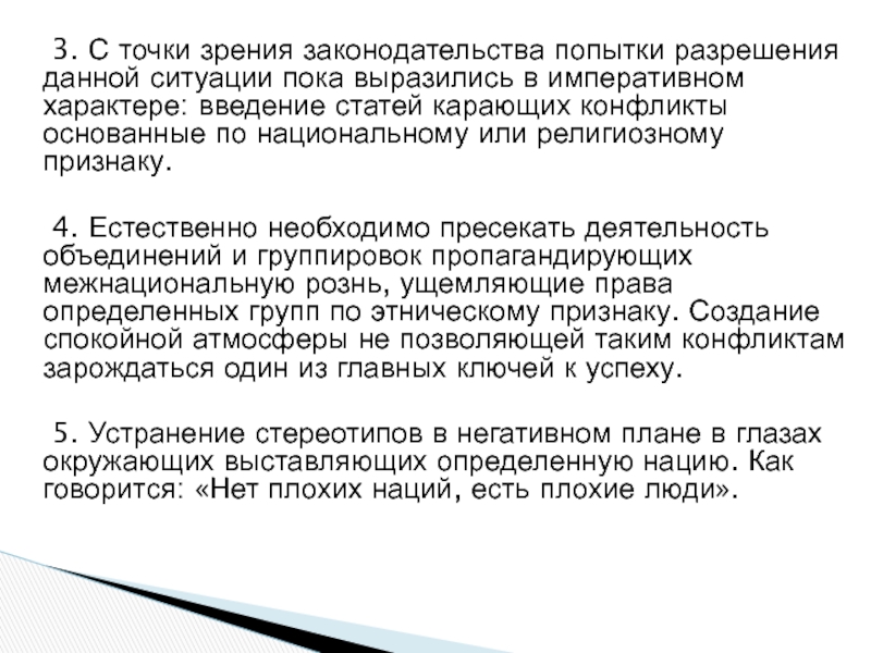 4. Естественно необходимо пресекать деятельность объединений и группировок пропагандирующих межнациональную рознь, ущемляющие права определенных групп по этническому признаку. Создание спокойной атмосферы не позволяющей таким конфликтам зарождаться один из главных ключей к успеху.