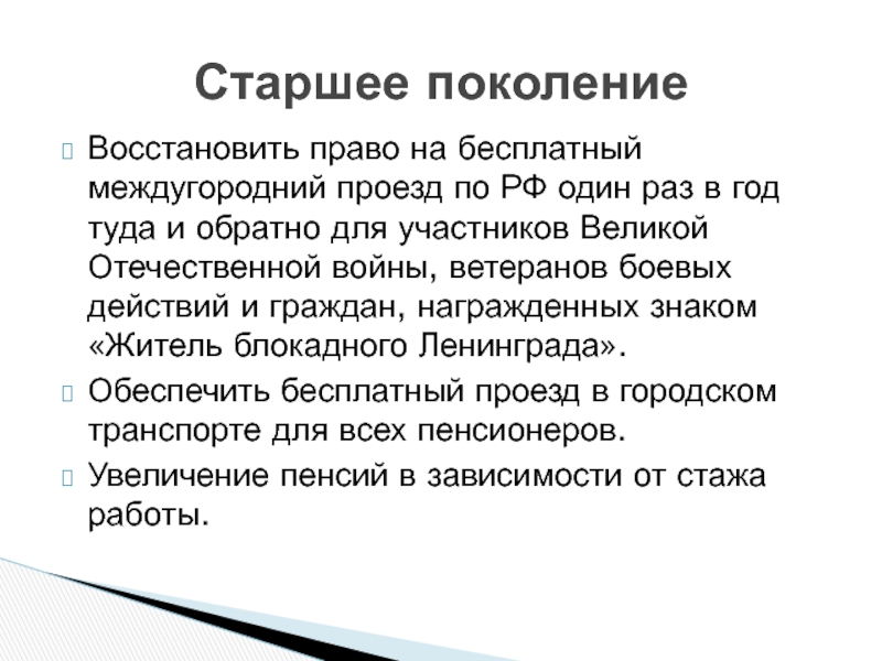 Слайд 9Восстановить право на бесплатный междугородний проезд по РФ один раз