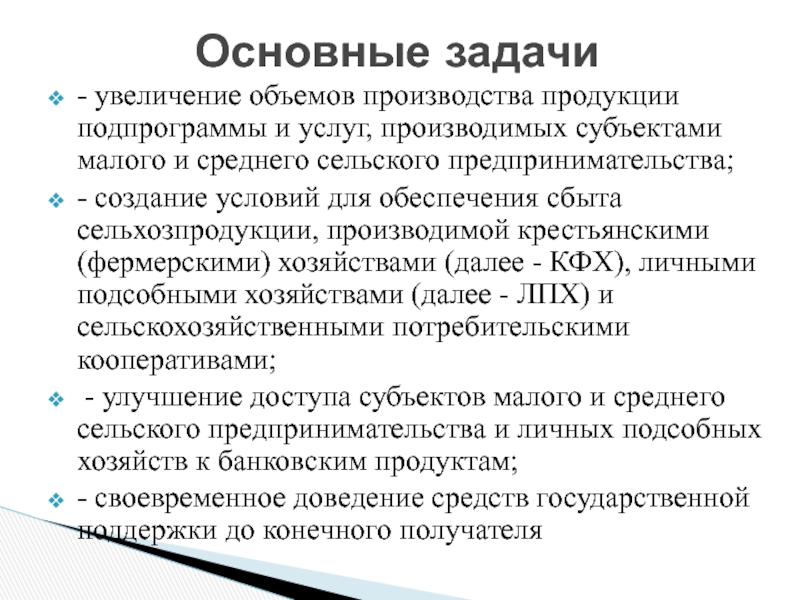 - улучшение доступа субъектов малого и среднего сельского предпринимательства и личных подсобных хозяйств к банковским продуктам;