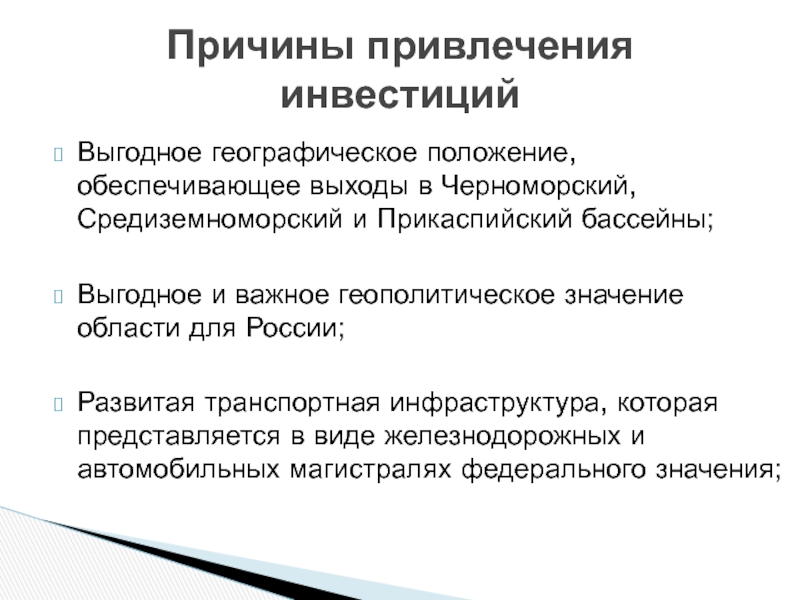 Слайд 27Выгодное географическое положение, обеспечивающее выходы в Черноморский, Средиземноморский и Прикаспийский