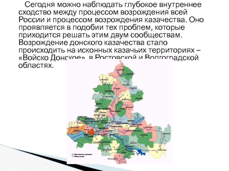 проявляется в подобии тех проблем, которые приходится решать этим двум сообществам. Возрождение донского казачества стало происходить на исконных казачьих территориях – «Войско Донское», в Ростовской и Волгоградской областях.