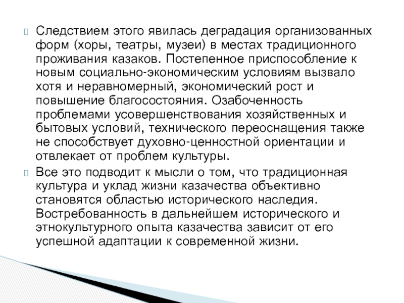 Все это подводит к мысли о том, что традиционная культура и уклад жизни казачества объективно становятся областью исторического наследия. Востребованность в дальнейшем исторического и этнокультурного опыта казачества зависит от его успешной адаптации к современной жизни.