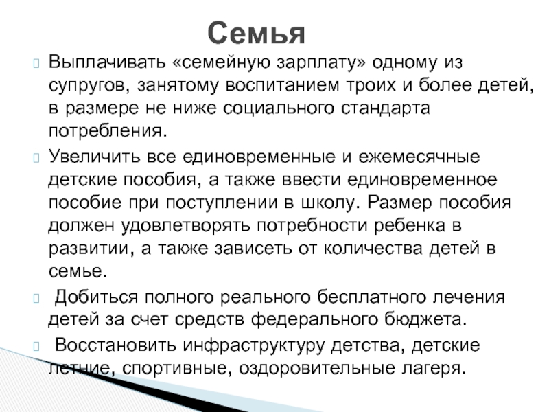Слайд 7Выплачивать «семейную зарплату» одному из супругов, занятому воспитанием троих и