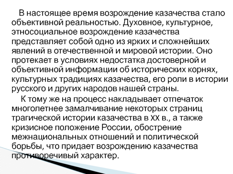 из ярких и сложнейших явлений в отечественной и мировой истории. Оно протекает в условиях недостатка достоверной и объективной информации об исторических корнях, культурных традициях казачества, его роли в истории русского и других народов нашей страны.