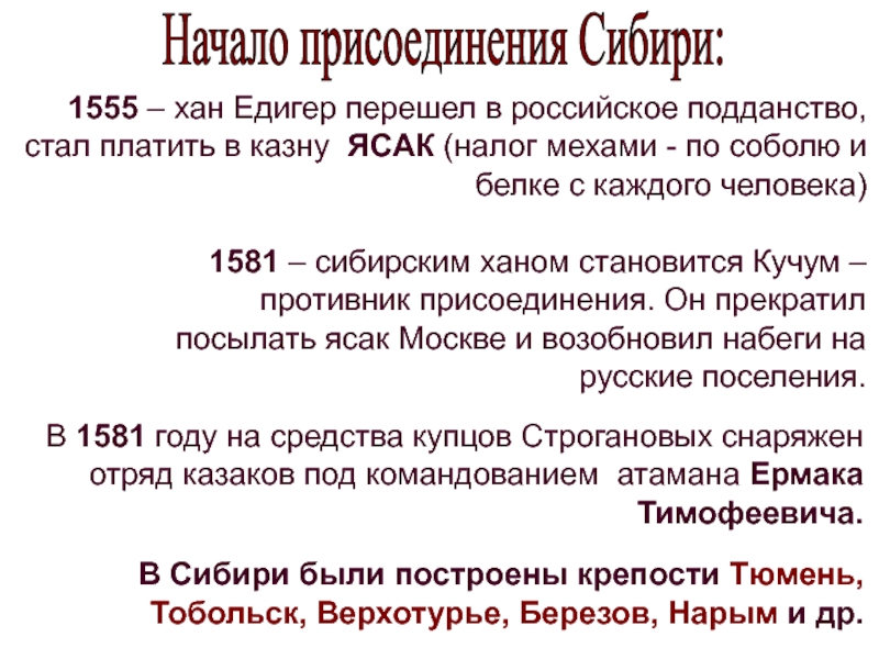В Сибири были построены крепости Тюмень, Тобольск, Верхотурье, Березов, Нарым и др.