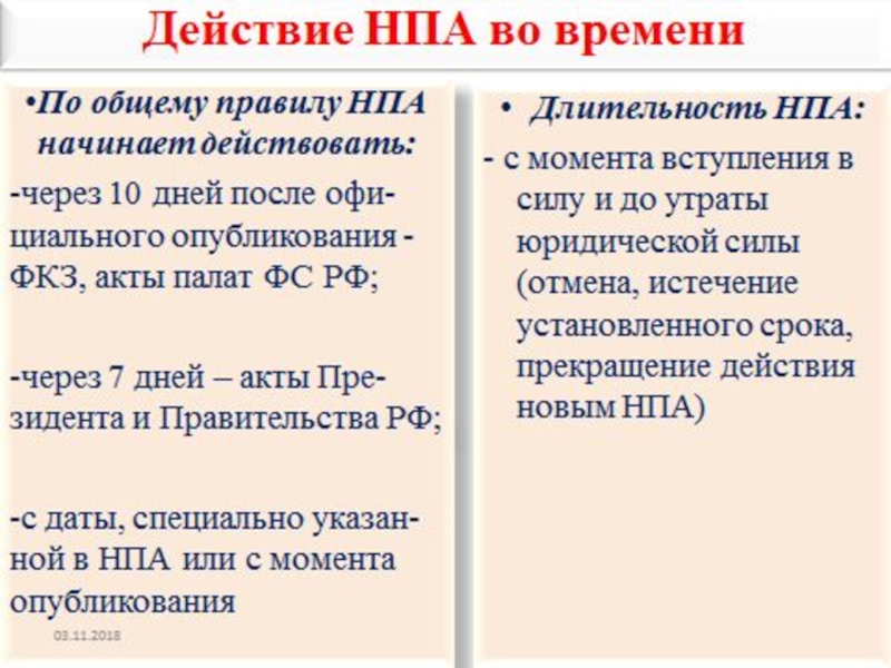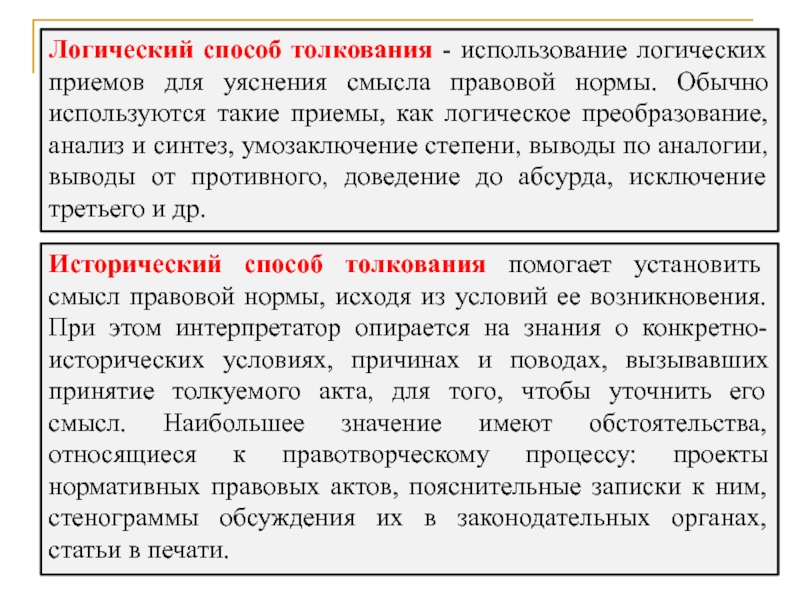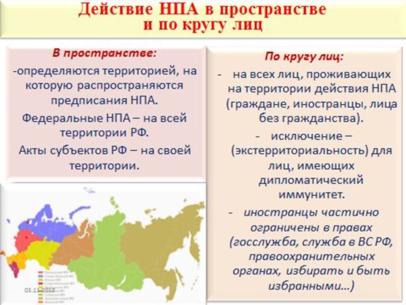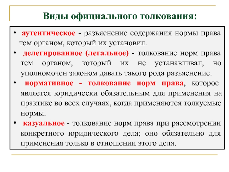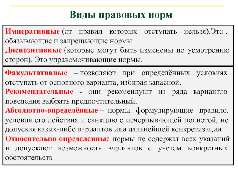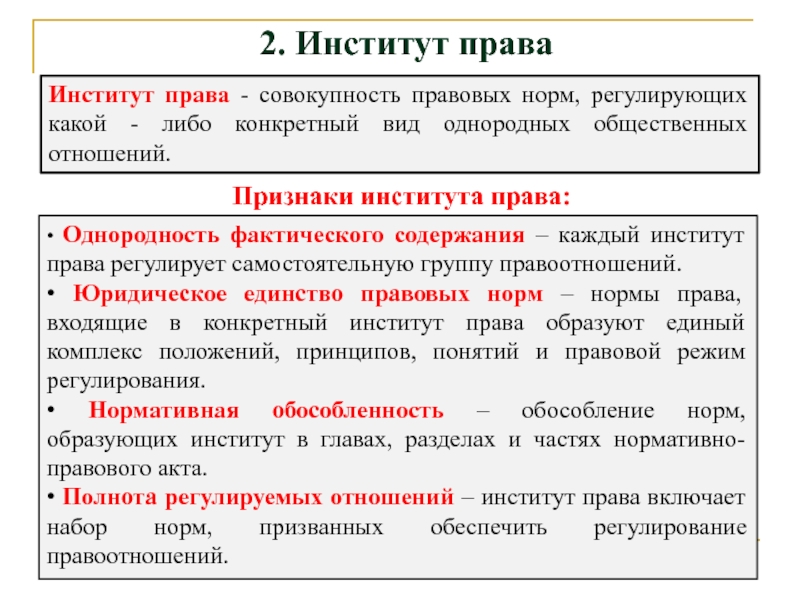 • Юридическое единство правовых норм – нормы права, входящие в конкретный институт права образуют единый комплекс положений, принципов, понятий и правовой режим регулирования.