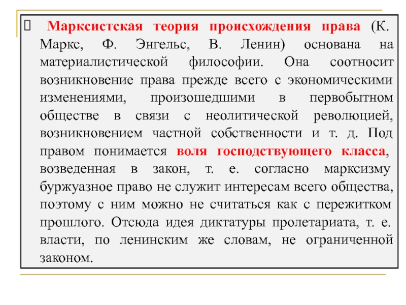 Слайд 6 Марксистская теория происхождения права (К. Маркс, Ф. Энгельс, В.