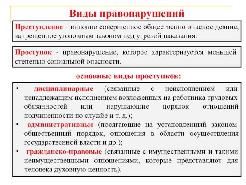 административные (посягающие на установленный законом общественный порядок, отношения в области осуществления государственной власти и др.);
