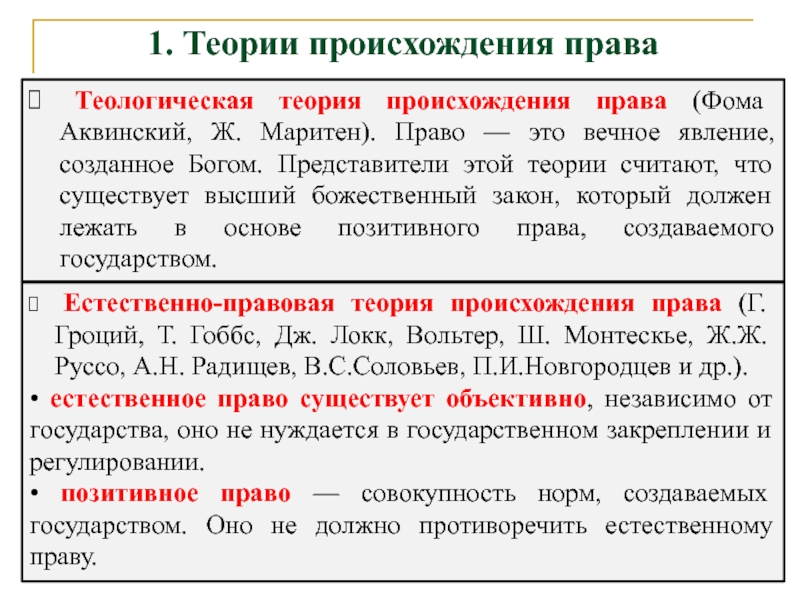 Естественно-правовая теория происхождения права (Г. Гроций, Т. Гоббс, Дж. Локк, Вольтер, Ш. Монтескье, Ж.Ж. Руссо, А.Н. Радищев, В.С.Соловьев, П.И.Новгородцев и др.).