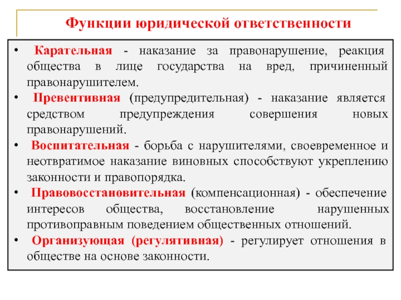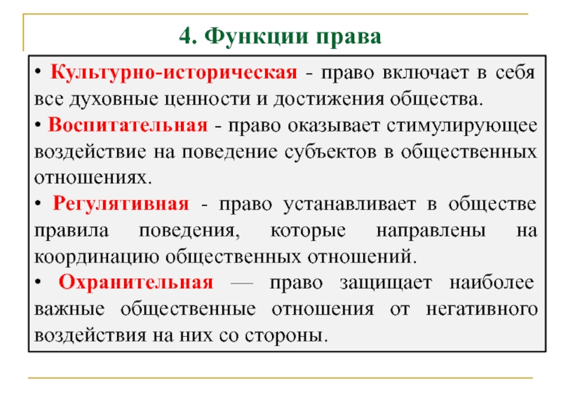 • Охранительная — право защищает наиболее важные общественные отношения от негативного воздействия на них со стороны.