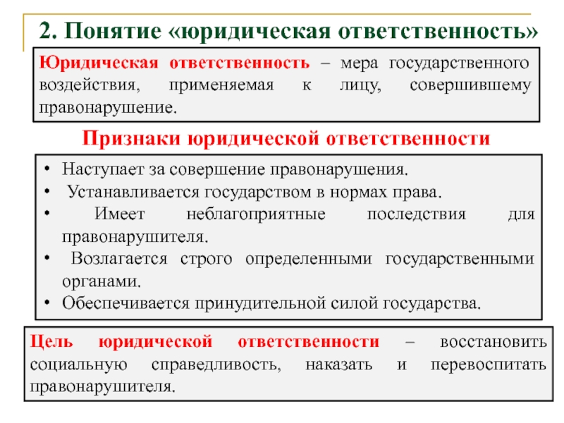 Цель юридической ответственности – восстановить социальную справедливость, наказать и перевоспитать правонарушителя.