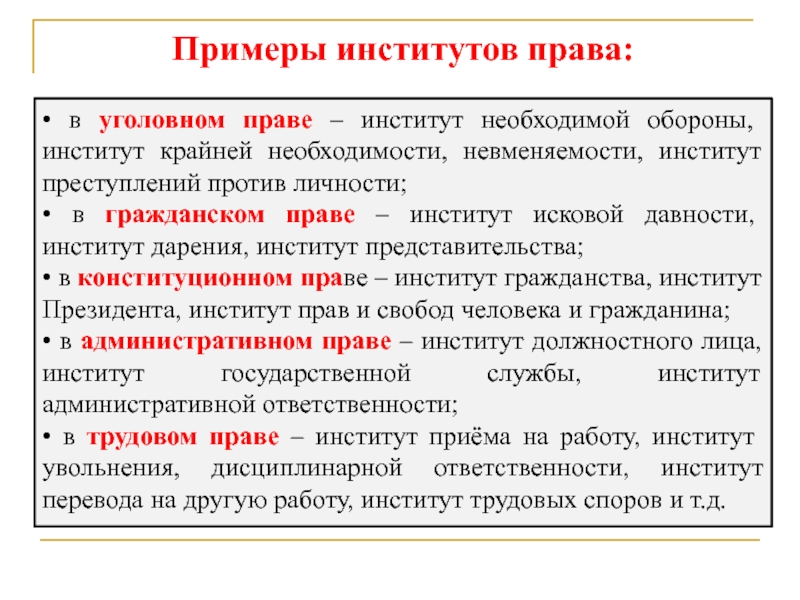 • в трудовом праве – институт приёма на работу, институт увольнения, дисциплинарной ответственности, институт перевода на другую работу, институт трудовых споров и т.д.