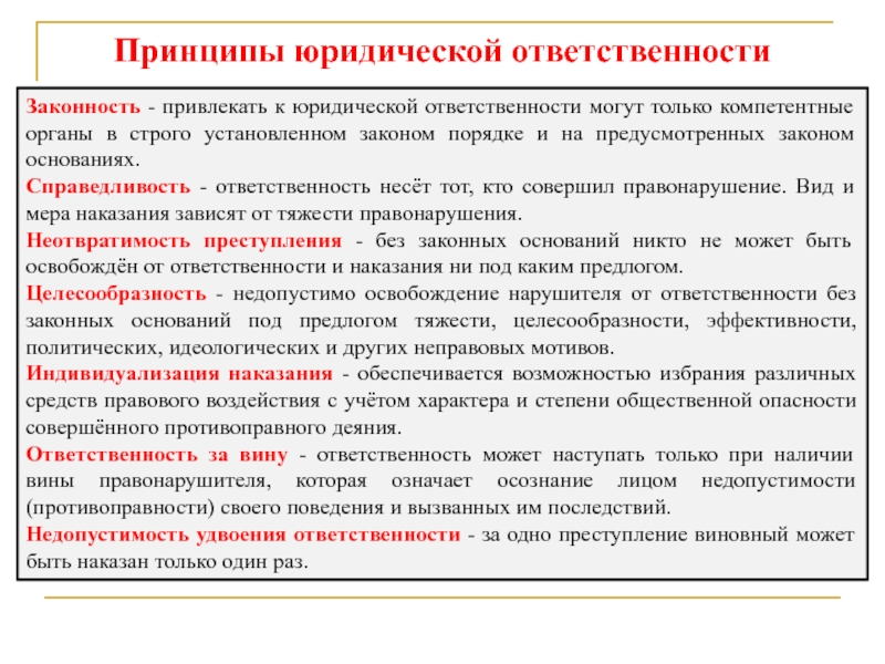 Справедливость - ответственность несёт тот, кто совершил правонарушение. Вид и мера наказания зависят от тяжести правонарушения.