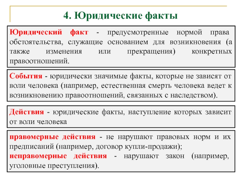 События - юридически значимые факты, которые не зависят от воли человека (например, естественная смерть человека ведет к возникновению правоотношений, связанных с наследством).