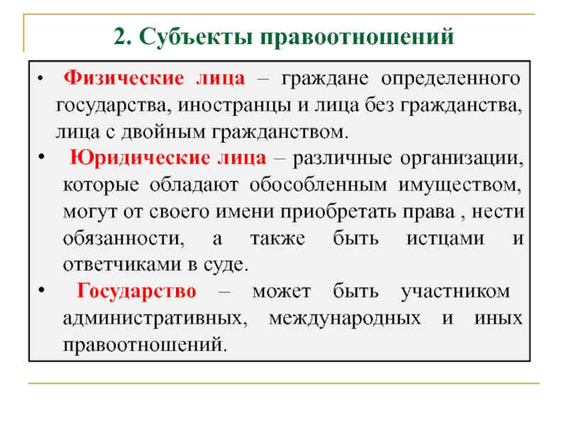 Юридические лица – различные организации, которые обладают обособленным имуществом, могут от своего имени приобретать права , нести обязанности, а также быть истцами и ответчиками в суде.