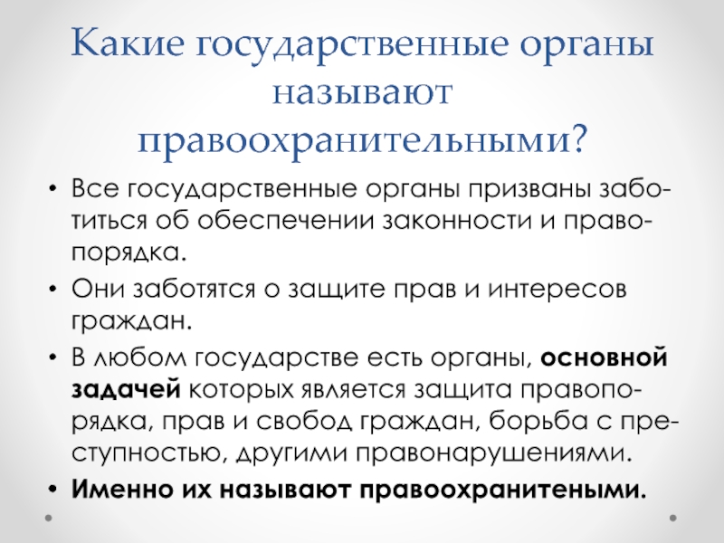 В любом государстве есть органы, основной задачей которых является защита правопо-рядка, прав и свобод граждан, борьба с пре-ступностью, другими правонарушениями.