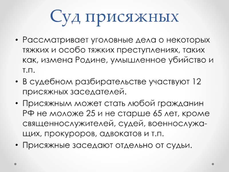 Присяжным может стать любой гражданин РФ не моложе 25 и не старше 65 лет, кроме священнослужителей, судей, военнослужа-щих, прокуроров, адвокатов и т.п.