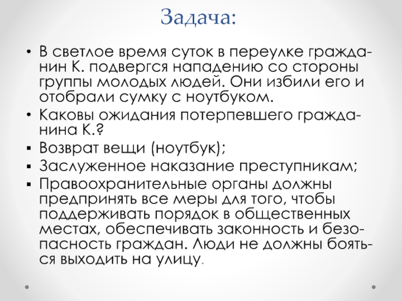 Правоохранительные органы должны предпринять все меры для того, чтобы поддерживать порядок в общественных местах, обеспечивать законность и безо-пасность граждан. Люди не должны боять-ся выходить на улицу.