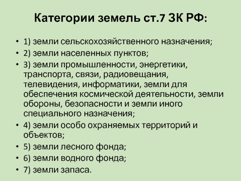 Слайд 15Категории земель ст.7 ЗК РФ: