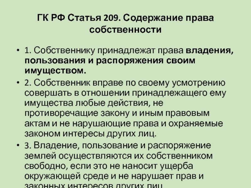 Слайд 12ГК РФ Статья 209. Содержание права собственности