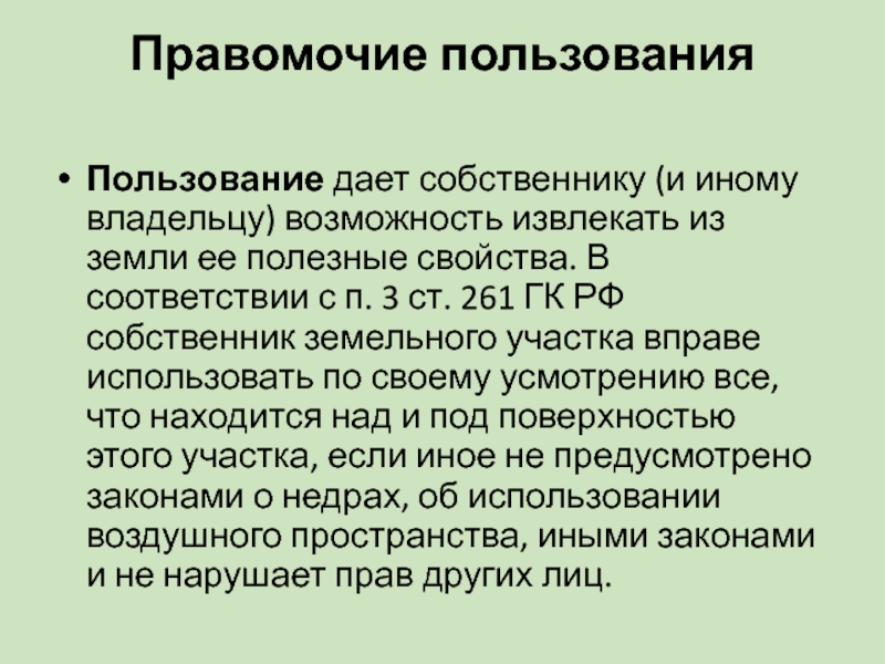 Правомочие владения дает возможность обладать землей на основании закона, т.