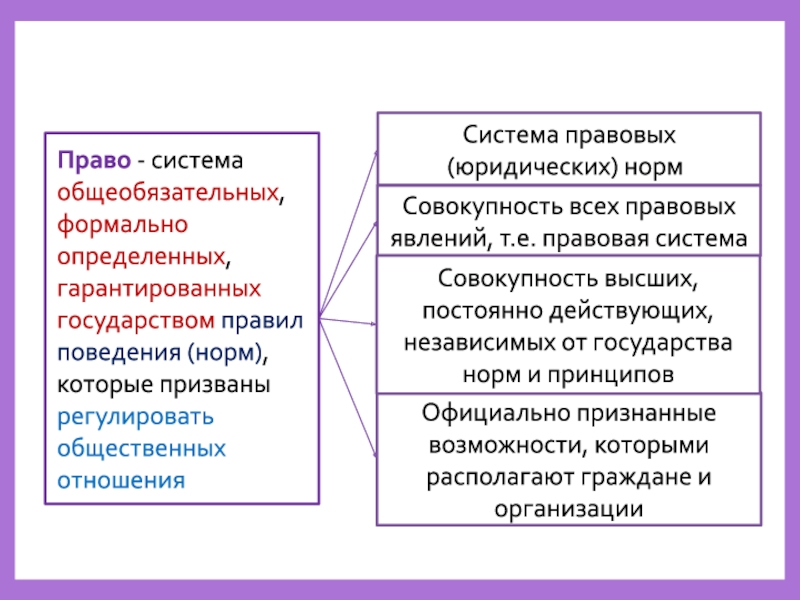 возможности, которыми располагают граждане и организацииСовокупность всех правовых явлений, т.е. правовая система
