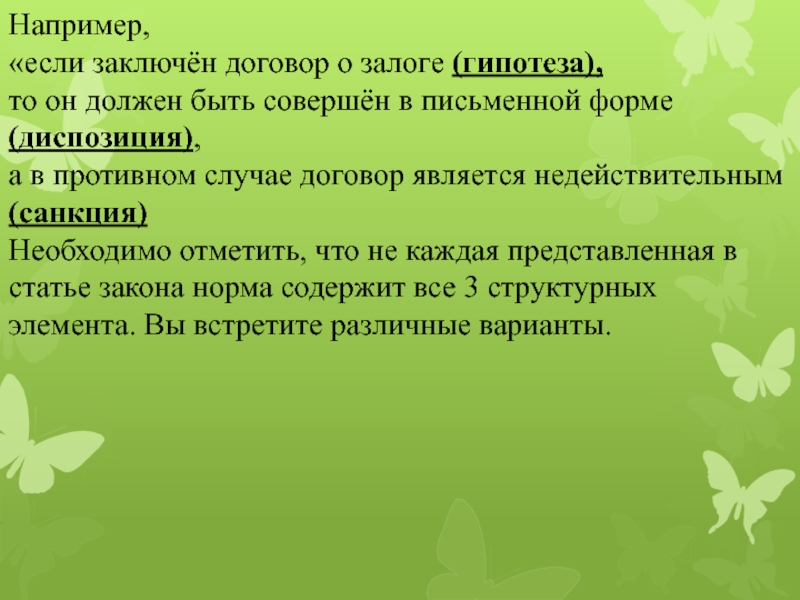Необходимо отметить, что не каждая представленная в статье закона норма содержит все 3 структурных элемента. Вы встретите различные варианты.