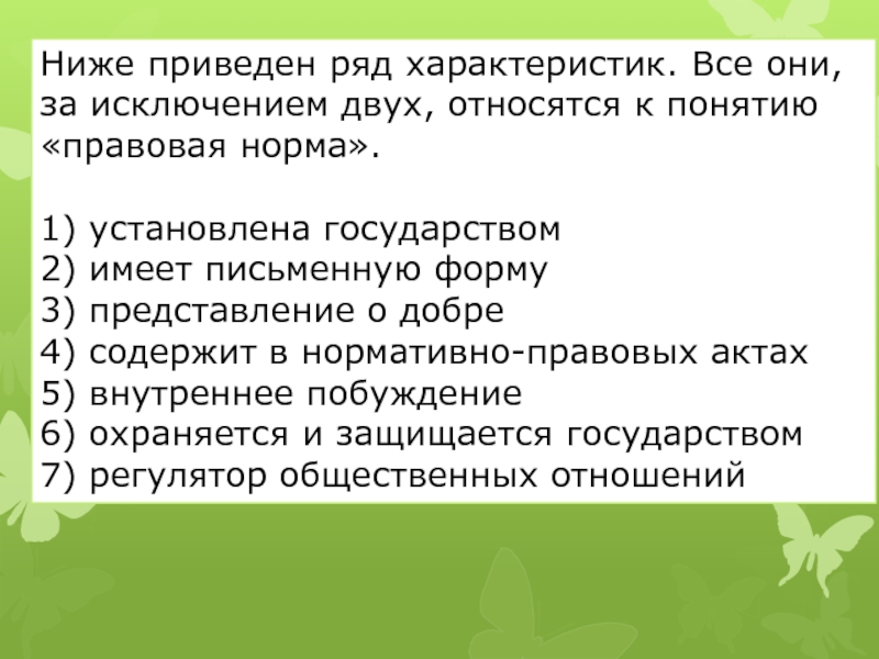 Слайд 24Ниже приведен ряд характеристик. Все они, за исключением двух, относятся